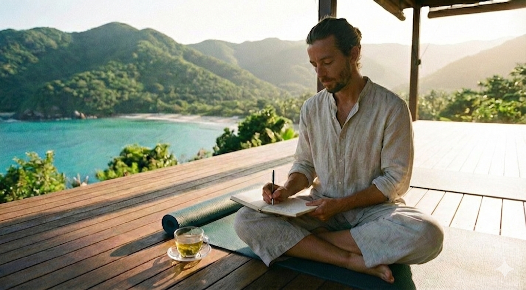 ヨガ・呼吸・ジャーナリングの時間を伝えています。